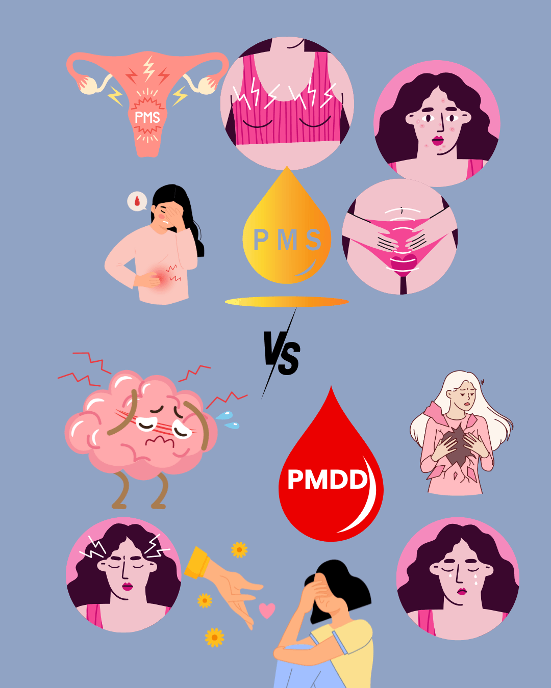 Det er stor forskel igen på definitionerne, og også hvor alvorligt det tages i forskellige lande og af forskellige behandlere. Men der er konsensus om at PMDD (også kaldet PMD) handler mere om det psykiske og mentale, og der vil være tale om væsentlige og invaliderende symptomer i forhold til PMS.